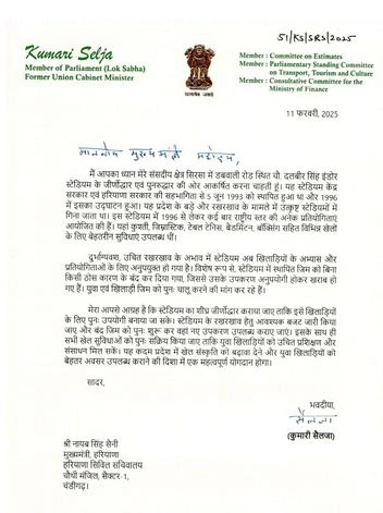 कुमारी सैलजा ने सिरसा के चौ. दलबीर सिंह स्टेडियम की बदहाली को लेकर सीएम को लिखा पत्र