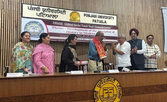 पटियाला, 27 मार्च : पंजाबी यूनिवर्सिटी में गुरू तेग बहादुर राष्ट्रीय एकता चेयर की तरफ से 15वांं शहीद सरदार नानक सिंह यादगारी भाषण करवाया गया। आधुनिक भारत में इतिहास विषय का विकास विषय पर यह भाषण इंद्रा गांधी नेशनल ओपन यूनिवर्सिटी दिल्ली से पहुंचे प्रो. एस.बी. उपाध्याए की तरफ से दिया गया। उन्होंने अपने भाषण में इतिहास विषय के आधुनिक स्वरूप को इख्तियार करने और इस रास्ते में आए अलग- अलग पड़ाओं बारे चर्चा की। उन्होंने कहा कि इतिहास हमेशा प्रमाणित स्रोतों पर आधारित और राजनैतिक दृष्टिकोणों से मुक्त होना चाहिए। उन्होंने बताया कि किस तरह संसार भर में अलग- अलग समय में इतिहास को अपने अपने दृष्टिकोण से पक्षपाती व्यवहार के साथ अपने हक में लिखा जाता रहा है। उन्होंने कहा आज के समय में इतिहास लेखनी के रास्ते में बहुत सी कठिनाईयां और पक्षपात हैं जो दूर होने जरूरी हैं। उन्होंने इतिहासकारों को न्योता दिया कि वह किसी भी तरह के निजी और संकुचित हितों से ऊपर उठ कर सही तरीके के साथ इतिहास लिखे।
