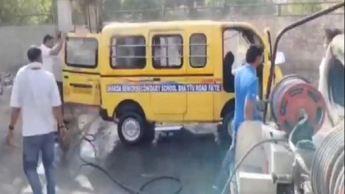 फतेहाबाद, 23 अप्रैल-school van caught fire: फतेहाबाद शहर के भट्टू रोड पर बुधवार सुबह एक स्कूल वैन (School Van) में आग लग गई। जिसके बाद वैन के ड्राइवर ने तत्परता दिखाते हुए सभी बच्चों को नीचे उतरा और आग पर काबू पाने के प्रयास किए गए। जानकारी के अनुसार सुबह एक बड़ा हादसा टल गया जब बच्चों से भरी एक स्कूल वैन में अचानक आग (Fire) लग गई। यह घटना भट्टू रोड पर उस समय हुई जब वैन शारदा स्कूल (Sharda School) के बच्चों को लेकर स्कूल की ओर जा रही थी। वैन से अचानक धुंआ उठता देख चालक ने तुरंत सूझबूझ का परिचय देते हुए वैन को रोका और सभी बच्चों को सुरक्षित बाहर निकाल लिया। बच्चों को बाहर निकालने के कुछ ही देर बाद वैन पूरी तरह से आग की लपटों में घिर गई।
