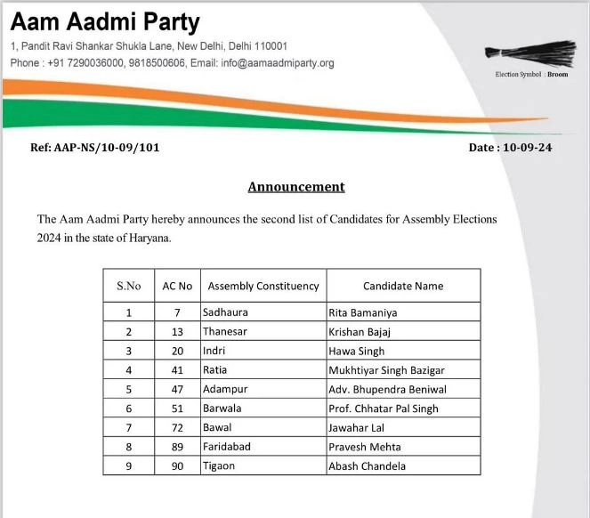 नई दिल्ली, 10 सितंबर : आम आदमी पार्टी द्वारा हरियाणा विधानसभा चुनाव के लिए भाजपा छोडक़र आप में शामिल हुए प्रो. छत्रपाल को बरवाला से उम्मीदवार घोषित किया गया है। इसी के साथ पार्टी अब तक 29 उम्मीदवारों का ऐलान कर चुकी है। इसी तरह साढौरा से रीता बमनैया को टिकट दिया गया है। थानेसर से कृष्ण बजाज और इंद्री से हवा सिंह को प्रत्याशी घोषित किया गया है। रतिया से मुख्त्यार सिंह बाजीगर, आदमपुर से एडवोकेट भूपेंद्र बेनीवाल, बावल से जवाहर लाल को टिकट दिया गया है। फरीदाबाद से प्रवेश मेहता और तिगांव से अबाश चंदेला को उम्मीदवार घोषित किया गया है।