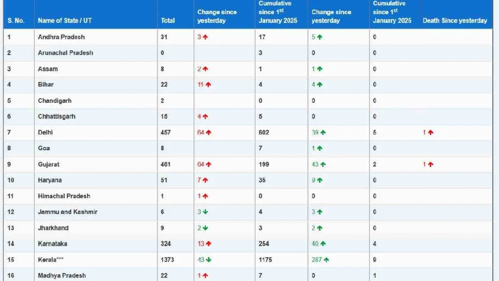 राज्यों की बात करें तो केरल 1,373 एक्टिव केस के साथ पहले स्थान पर है, इसके बाद महाराष्ट्र में 510, गुजरात में 461, दिल्ली में 457 और पश्चिम बंगाल में 432 एक्टिव केस हैं।