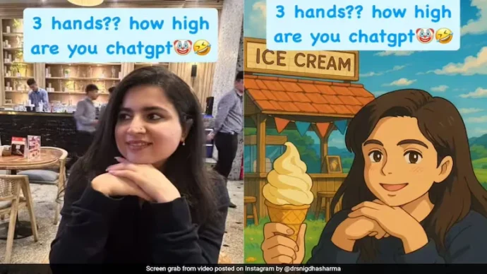 AI ने एक छवि बनाई जिसमें कुछ अजीब गलतियाँ थीं। एक तस्वीर में एक महिला को एक कैफ़े में बैठा दिखाया गया था। लेकिन AI ने गलती से एक तीसरा हाथ जोड़ दिया जो आइसक्रीम कोन पकड़े हुए था। इतना ही नहीं कैफ़े की जगह AI ने उसे खुले मैदान में रख दिया और पीछे एक आइसक्रीम की दुकान बना दी मानो वह हमेशा से वहाँ थी। इस मज़ेदार गलती को इंस्टाग्राम पर “ChatGPT-तुमसे ना हो पाएगा..” कैप्शन के साथ पोस्ट किया गया जिससे लोग हंसने लगे। कुछ यूजर्स ने मज़ाक किया कि कुर्सी के पैर जैसा दिख रहा था जिससे AI भ्रमित हो गया हो।