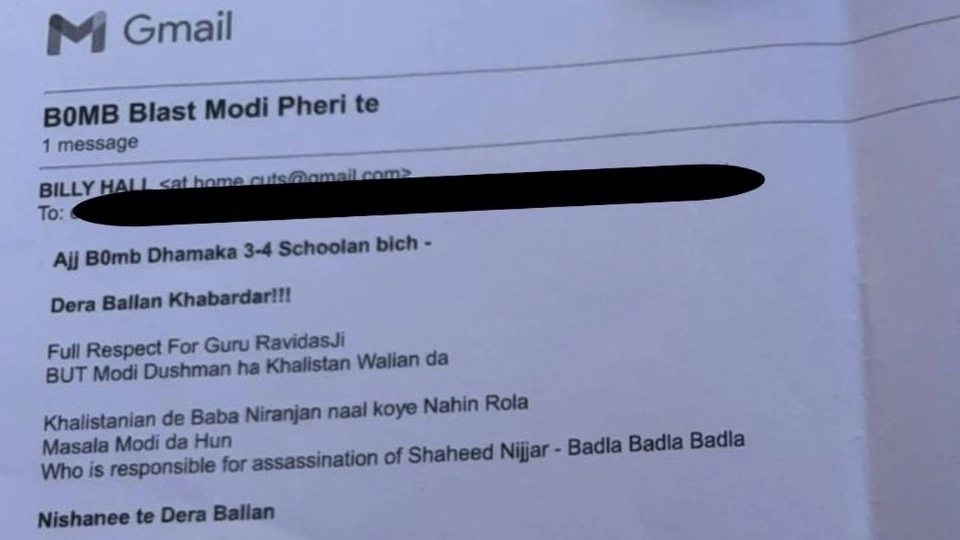 मिली जानकारी के अनुसार ईमेल में कहा गया कि तीन से चार स्कूलों में बम विस्फोट किए जाएंगे। यह धमकी सिर्फ मोदी के दौरे से जुड़ी है। ईमेल में लिखा है कि डेरा सच्चखंड बल्लां और संत निरंजन दास जी से इसका कोई लेना-देना नहीं है। निज्जर की कनाडा में हत्या का जिक्र करते हुए कहा गया कि मोदी खालिस्तान का दुश्मन है।