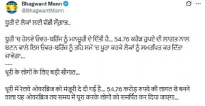 पंजाब, 29 जून 2025: पंजाब के मुख्यमंत्री भगवंत मान ने पंजाब के लोगों को ख़ास तोहफा दिया है। सीएम भगवंत मान ने ट्वीट करते हुए यह बड़ी जानकारी दी। उन्होंने एक्स (ट्विटर) पर जानकारी देते हुए लिखा कि, ”धूरी के लोगों को बड़ा तोहफा दिया गया है। धूरी में रेलवे ओवरब्रिज को मंजूरी मिल गई है। 54.76 करोड़ रुपये की लागत से बनने वाले इस ओवरब्रिज को तय समय में पूरा करके लोगों को समर्पित कर दिया जाएगा।” धूरी में रेलवे ओवरब्रिज को मंजूरी मिलने से पंजाब के लोगों को बहुत फायदा मिलेगा।