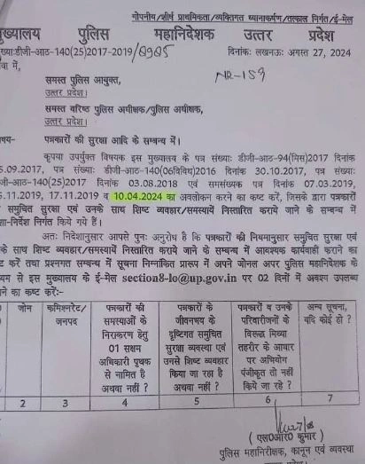 इस जवाब को दो दिन में विभाग की ईमेल पर भेजने का निर्देश दिया गया था इस संबंध में किसी भी जिले में पुलिस कमिश्नर व एसएसपी ने ना ही पत्रकारों की मीटिंग बुलाई और ना ही किसी पत्रकार संगठन के अध्यक्ष सदस्यों से उनकी समस्या सुरक्षा के संबंध में कोई जानकारी हासिल की बल्कि फर्जी तरीके से डीजीपी के पत्र का जवाब देकर आदेश को रद्दी की टोकरी में डाल दिया उन्होंने कहा कि वर्ष 2017, 2018, 2019, में भी डीजीपी कार्यालय द्वारा पत्रकारों की सुरक्षा सम्मान व फर्जी मुकदमे से संबंधित पत्र लिखे गए थे और सख्त निर्देश दिए गए थे लेकिन उन पत्रों के बाद भी जिले के पुलिस कप्तानों ने कोई मीटिंग नही ली और न ही पत्रकारों के ऊपर दर्ज मुकदमे पर कोई ध्यान दिया गया।