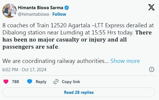 नई दिल्ली, 18 अक्तूबर :असम में अगरतला लोकामान्य तिलक एक्सप्रेस के डिब्बे अचानक पटरी से उतरने के कारण वहां बड़ा हादसा हो गया। जानकारी के अनुसार इस घटना में इंजन समेत 8 डिब्बे पटरी से उतरे हैं, लेकिन राहत की बात यह है कि किसी भी यात्री के हताहत होने की सूचना नहीं है। यह घटना लुमडिंग डिविजन के अंतर्गत लुमडिंग-बर्डरपुर हिल सेक्शन में हुई। रेलवे प्रवक्ता ने भी पुष्टि की है कि दुर्घटना में किसी प्रकार की हताहत की जानकारी नहीं मिली है। इस संबंध में असम के मुख्यमंत्री हिमंता बिस्वा सरमा ने सोशल मीडिया के माध्यम से घटना की जानकारी साझा की है। उन्होंने बताया कि कोई बड़ा नुकसान नहीं हुआ है और सभी यात्री सुरक्षित हैं। सीएम ने लिखा, ट्रेन 12520 अगरतला-एलटीटी एक्सप्रेस के 8 डिब्बे आज 15:55 बजे लुमडिंग के पास डिबालोंग स्टेशन पर पटरी से उतर गए। हम रेलवे अधिकारियों के साथ समन्वय कर रहे हैं और राहत ट्रेन जल्द ही घटनास्थल पर पहुंचेगी। ट्रेन गुरुवार सुबह रवाना हुई थी, और जैसे ही दुर्घटना की जानकारी मिली, रेलवे अधिकारियों और पुलिस की टीम घटनास्थल पर रवाना हो गई। मंडल के वरिष्ठ अधिकारी भी राहत और बचाव कार्य के लिए मौके पर पहुंचे हैं।