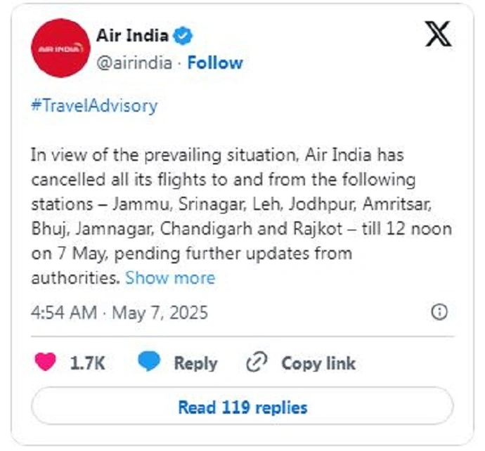इसी तरह एयर इंडिया ने नौ शहरों में व्यवधान की घोषणा की है। मौजूदा स्थिति को देखते हुए, एयर इंडिया ने 7 मई को दोपहर 12 बजे तक निम्नलिखित स्टेशनों – जम्मू, श्रीनगर jammu kashmir, लेह, जोधपुर jodhpur, अमृतसर amritsar, भुज, जामनगर, चंडीगढ़ chandigarch और राजकोट – के लिए अपनी सभी उड़ानें रद्द कर दी हैं,