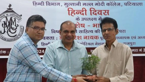 पटियाला : स्थानीय मुल्तानी मल्ल मोदी कालेज, पटियाला में हिन्दी विभाग की ओर से प्रधानाचार्य डॉ. नीरज गोयल जी के योग्य मार्गदर्शन अधीन हिन्दी दिवस के उपलक्ष्य में “हिंदी साहित्य की समृद्ध परम्परा” विषय पर विशेष-भाषण का आयोजन किया गया। इस विशेष-भाषण में डॉ. सुरेश नायक पूर्व प्रोफेसर एवं अध्यक्ष हिंदी विभाग, पटेल मेमोरियल नेशनल कॉलेज, राजपुरा मुख्य वक्ता के रूप में शामिल हुए। कॉलेज के प्रधानाचार्य डॉ. नीरज गोयल ने मुख्य वक्ता का स्वागत किया और इस आयोजन में भाग लेने वाले विद्यार्थियों को शुभकामनाएँ दीं। अपने भाषण में उन्होंने कहा कि वर्तमान तकनीकि विकास के दौर में हिन्दी भाषा अपनी वैज्ञानिकता और समृद्धि के कारण ज्ञान-विज्ञान और कम्प्यूटर की भाषा बनने में सक्षम है। उन्होंने कहा कि हिंदी न केवल राष्ट्रीय भाषा के रूप में अंतरराष्ट्रीय स्तर पर देश का प्रतिनिधित्व करती है बल्कि इसने समूचे राष्ट्र को भी एकता के सूत्र में पिरोये रखा है। इसके साथ ही उन्होंने कहा कि एक भाषा नयी तकनीक को अंगीकार करने में निपुण होनी चाहिए और उसका साहित्य सांस्कृतिक रूप से समृद्ध और सार्वभौमिक होना चाहिए और हिंदी ऐसी ही समर्थ भाषा है।