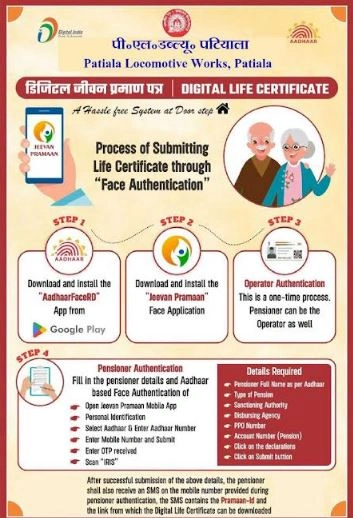 पटियाला : श्री प्रमोद कुमार, प्रधान प्रशासनिक अधिकारी, पटियाला लोकोमोटिव वर्क्स (पी॰एल॰डब्ल्यू॰), पटियाला एवं महाप्रबंधक, रेल कोच फैक्ट्री (आर.सी.एफ.), कपूरथला के दिशा-निर्देशन में , एव डॉ. बिक्रम सिंह गिल प्रमुख वित्तीय सलाहकार की अगवाई में, पी॰एल॰डब्ल्यू॰ ने “डिजिटल जीवन प्रमाण पत्र अभियान 3.0” की शुरुआत की है। इस पहल का उद्देश्य वार्षिक जीवन प्रमाण पत्र प्रस्तुत करने की प्रक्रिया को सरल बनाना है, जिससे वरिष्ठ नागरिक आवश्यक दस्तावेज़ डिजिटल रूप से जमा कर सकें । यू.आई.डी.ए.आई. (UIDAI) और इलेक्ट्रॉनिक्स एवं सूचना प्रौद्योगिकी मंत्रालय (MeitY) के सहयोग से, पेंशन और पेंशनभोगी कल्याण विभाग (DoPPW) ने 70 लाख केंद्रीय सरकारी पेंशनभोगियों के लिए “इज ऑफ लिविंग” बढ़ाने हेतु फेस प्रमाणीकरण सुविधा शुरू की है। इस सुविधा से पेंशनभोगी अपने जीवन प्रमाण पत्र को आसानी से घर बैठे जमा कर सकते हैं।