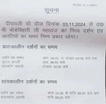नई दिल्ली, 4 नवंबर : वृंदावन जाने वाले श्रद्धालुओं के लिए एक नया समाचार सामने आया है। जानकारी के अनुसार वृंदावन के बांके बिहारी मंदिर दर्शन के समय में 3 नवंबर यानि भाई दूज से बदलाव कर दिया गया है। इसके साथ ही नित्य दर्शन और आरती के समय में भी परिवर्तन किया गया है। भाईदूज और सप्ताहांत होने के कारण रविवार को ठाकुर श्री बांके बिहारी जी के दर्शन के लिए बड़ी संख्या में भक्त पहुंचे। भक्तों के पहुंचने का क्रम सुबह 4 बजे से ही शुरू हो गया था। ठाकुर बांके बिहारी के पट सुबह 8:30 से दोपहर 1:00 तक और शाम को 4:30 से 8:30 तक खुलेंगे। इसी समय के बीच श्रद्धालुओं को बांके बिहारी दर्शन देंगे। इसको लेकर मंदिर प्रबंधक कमेटी ने लेटर भी जारी कर दिया है।